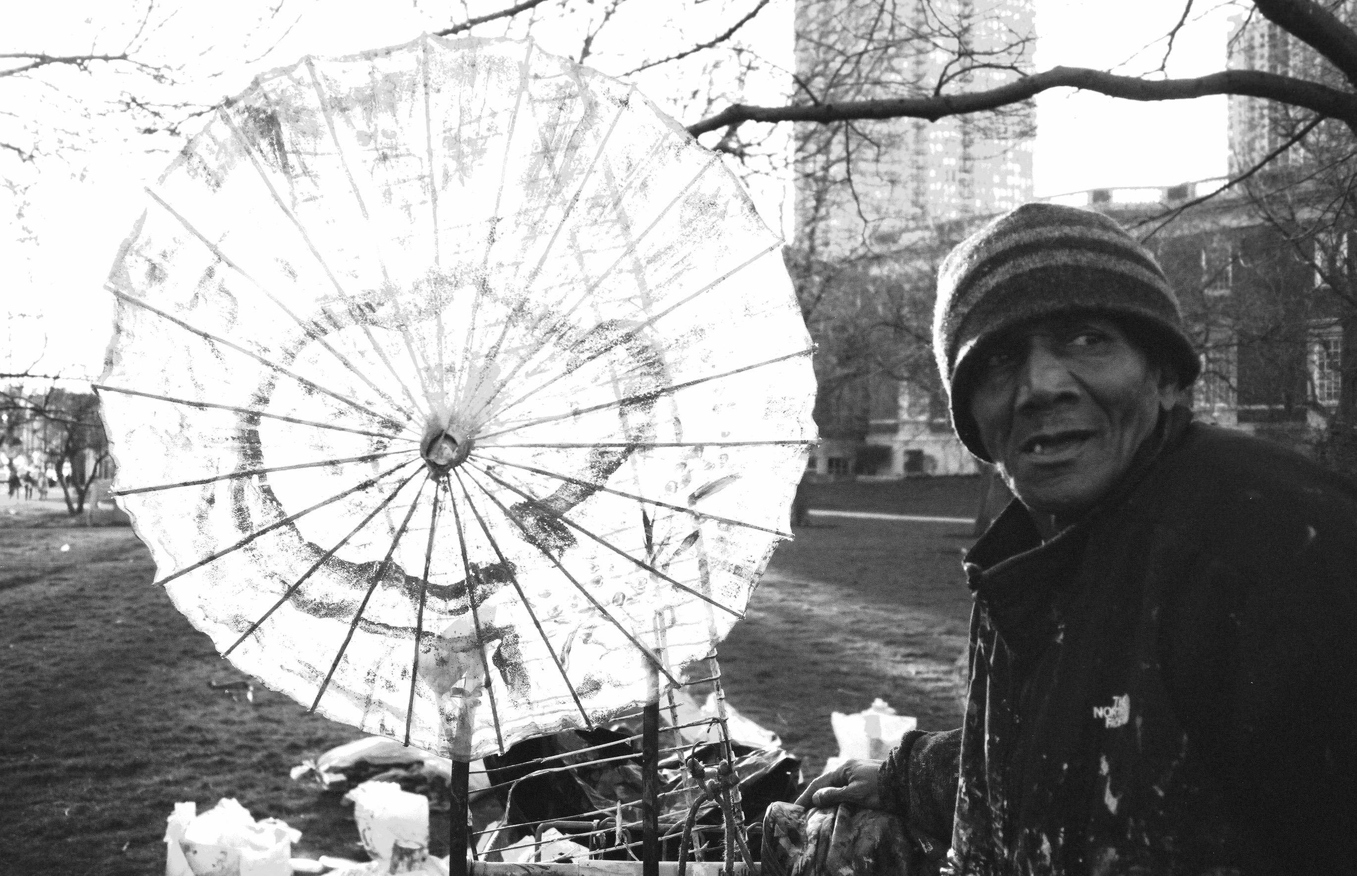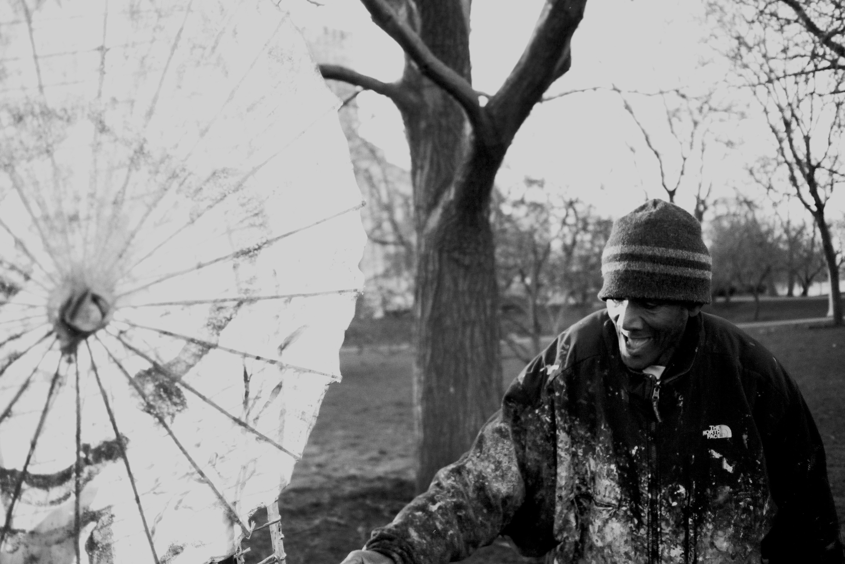 George painting in Lincoln Park, Chicago. He sets up shop and paints umbrellas. Shot at dusk with Contax T3 Carl Zeiss Sonnar T* f/2.8 – f/16. T3 Ilford Delta 100.