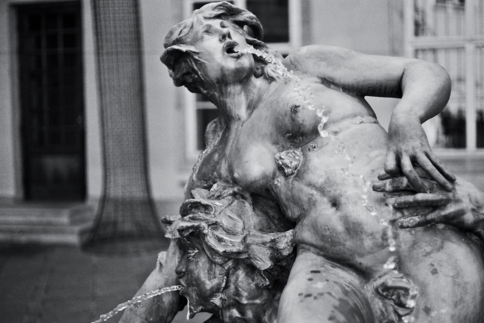 The following photos I shot using a Leica R5 50 mm summicron lens. Photos with a lot of grain have a expressionistic quality to me. Here are some photos I shot utilizing fine grain and a larger grain. The following examples of photos are shot using different film stocks. The first shot was shot with Ilford XP 400 ASA pushed to 800 ASA. I like the heavy grain that surrounds the black and white mural which shows little grain do to the stark black and white image. I like the duality of one photo having heavy grain and fine grain. The second shot I used Delta 100 ASA. I like the use of fine grain here because the painting on the wall is delicate. Same is true in the following fountain shots. The third photo of the fountain was shot with Delta Pro 3200 ASA and the grain helps with the water spraying and adds to the low angle commanding subject mater. The final shot of the fountain was shot with Delta pro 100 ASA, delicate fine grain capturing the flesh and single spout of water. Same subject matters different grain approach for different visual effect.
