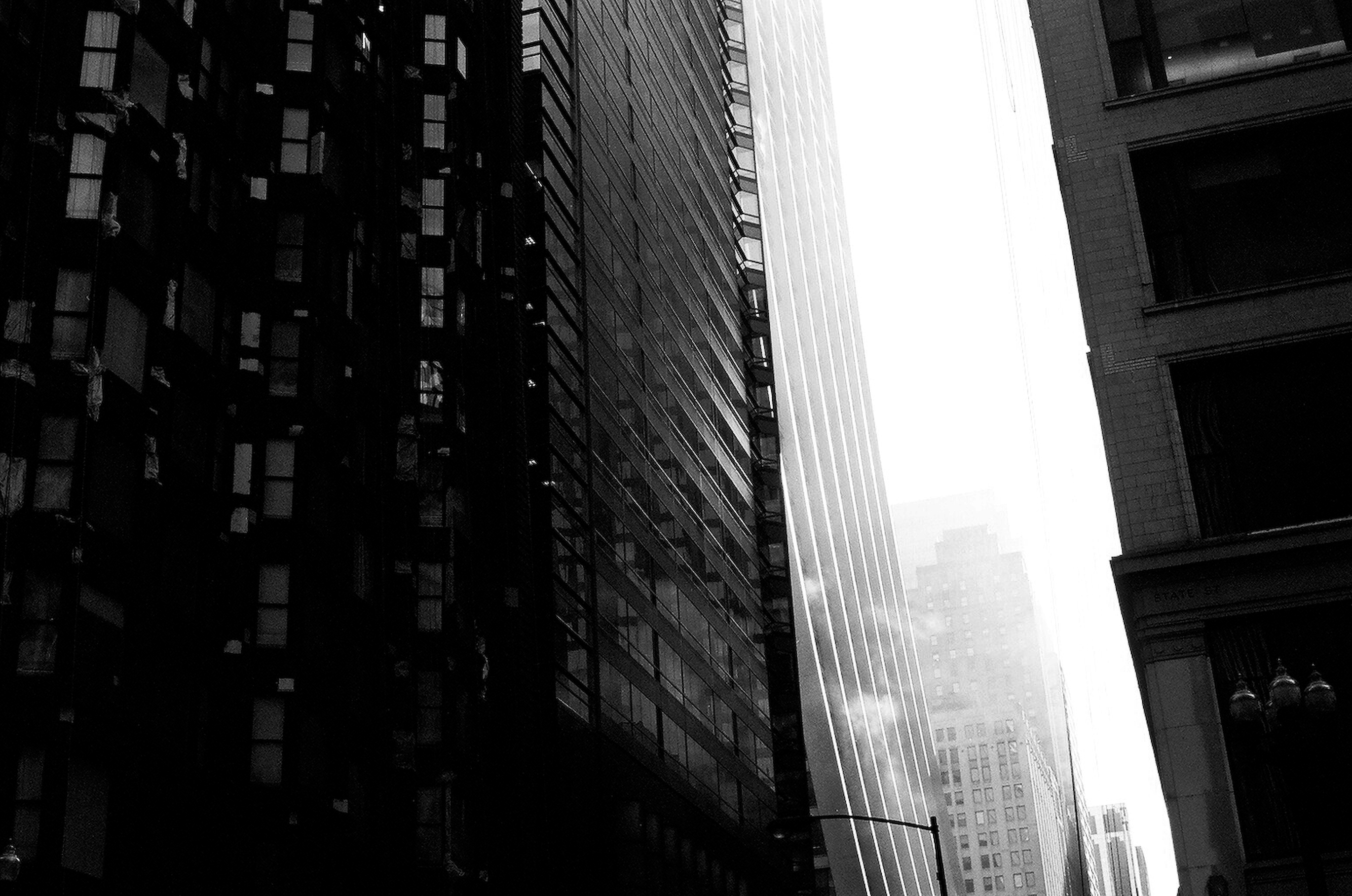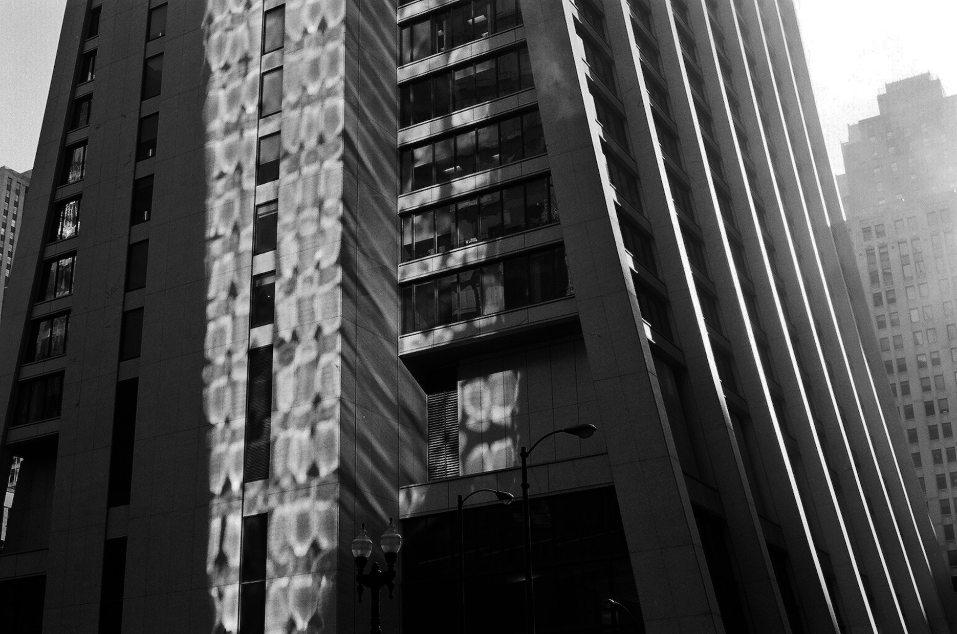The building in the distance with the curved base, design architects for the construction were C.F. Murphy Associates, Stanislaw Z. Gladych and Perkins and Will. The building first opened in 1969 as First National Plaza. Currently known as Chase Tower. Shot with Contax G2 48mm 2.0 Zeiss Lens. Kodak Porta 400asa de-saturated.