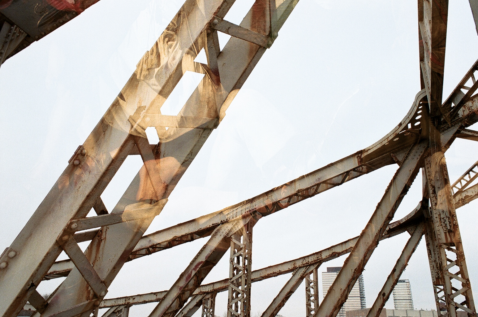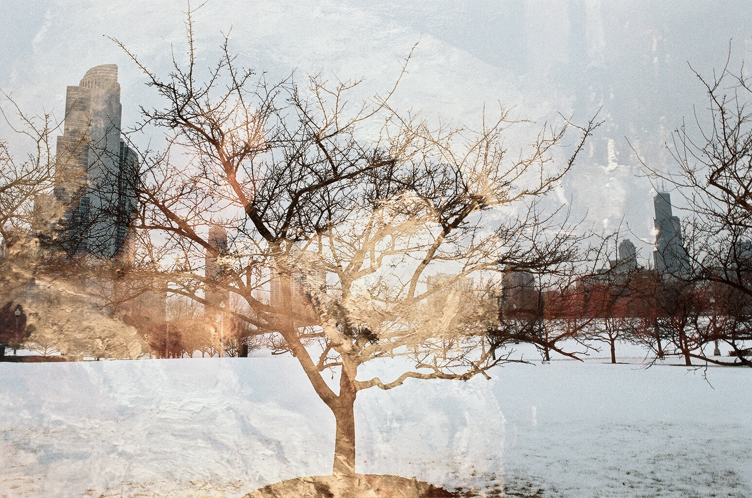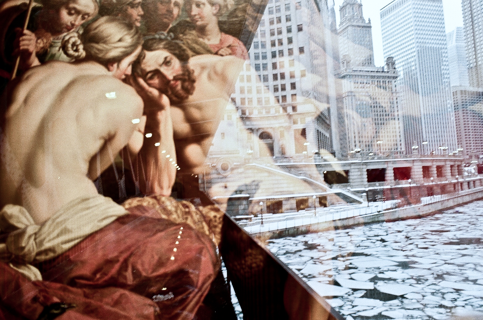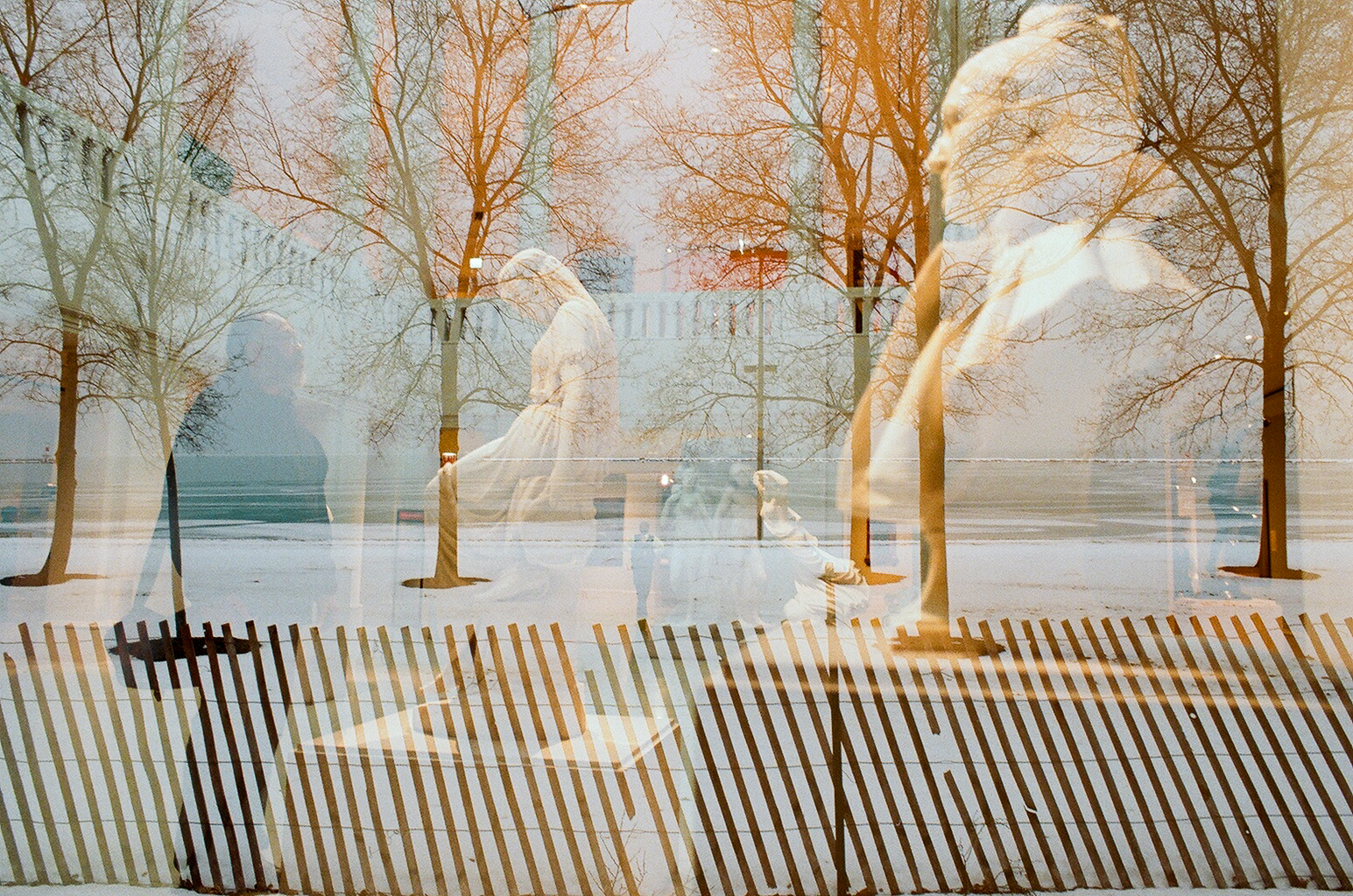 The following double exposures I shot with a Nikon f2 and a Nikon 28mm 1.8 lens using Kodak 100asa color film. The following double exposures where executed by shooting the whole roll of film instead of doing individual double exposures. The first images laid down where paintings and sculptures from the Art Institute Chicago (AIC). My idea was to take larger than life images and sculptures and place them outside the museum on Chicago’s landscape, buildings, bridges and parks. Repurpose the art and let it take on life outside the four walls of the museum.